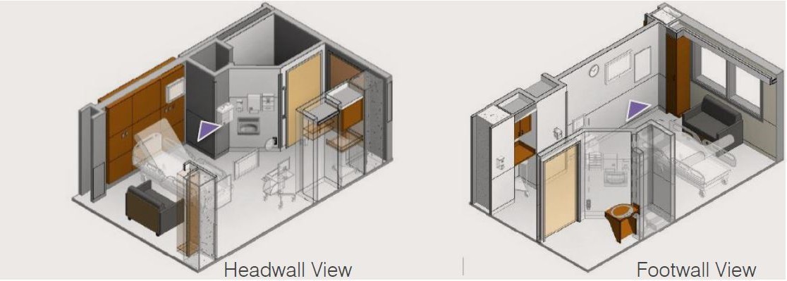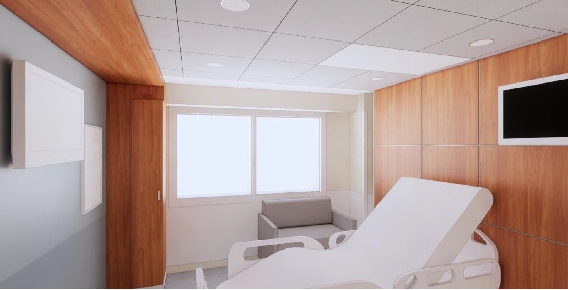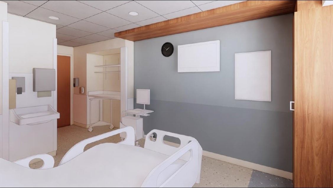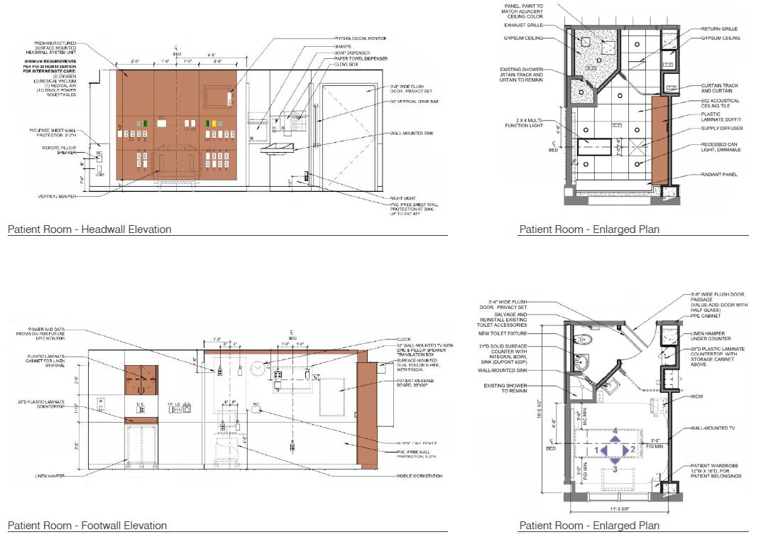 Because this project was at a small scale, we zoomed in on a lot of details including equipment, material finishes, how patients will feel, how clinicians can enter the room, accessibility for when the patient needs to go to the bathroom, and how nurses can safely monitor the patient, as well as comfortably move around. These interior renders were used to communicate the feel and application of these patient rooms with stakeholders and the design team. This way, stakeholders and equipment team can discuss what works, what can be improved on, and how this matches up to the clinician teams' and clients' goals. Then we implemented agreed upon design decisions and developed our drawings accordingly, while following accessible guidelines and city codes.