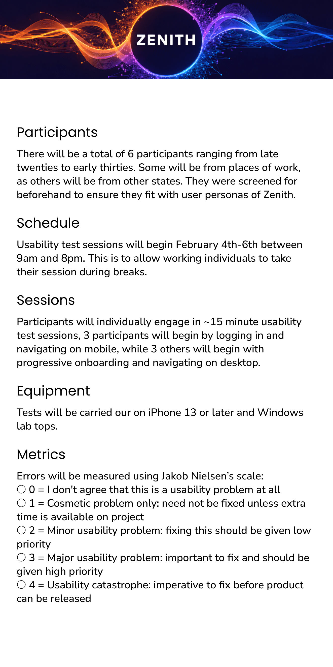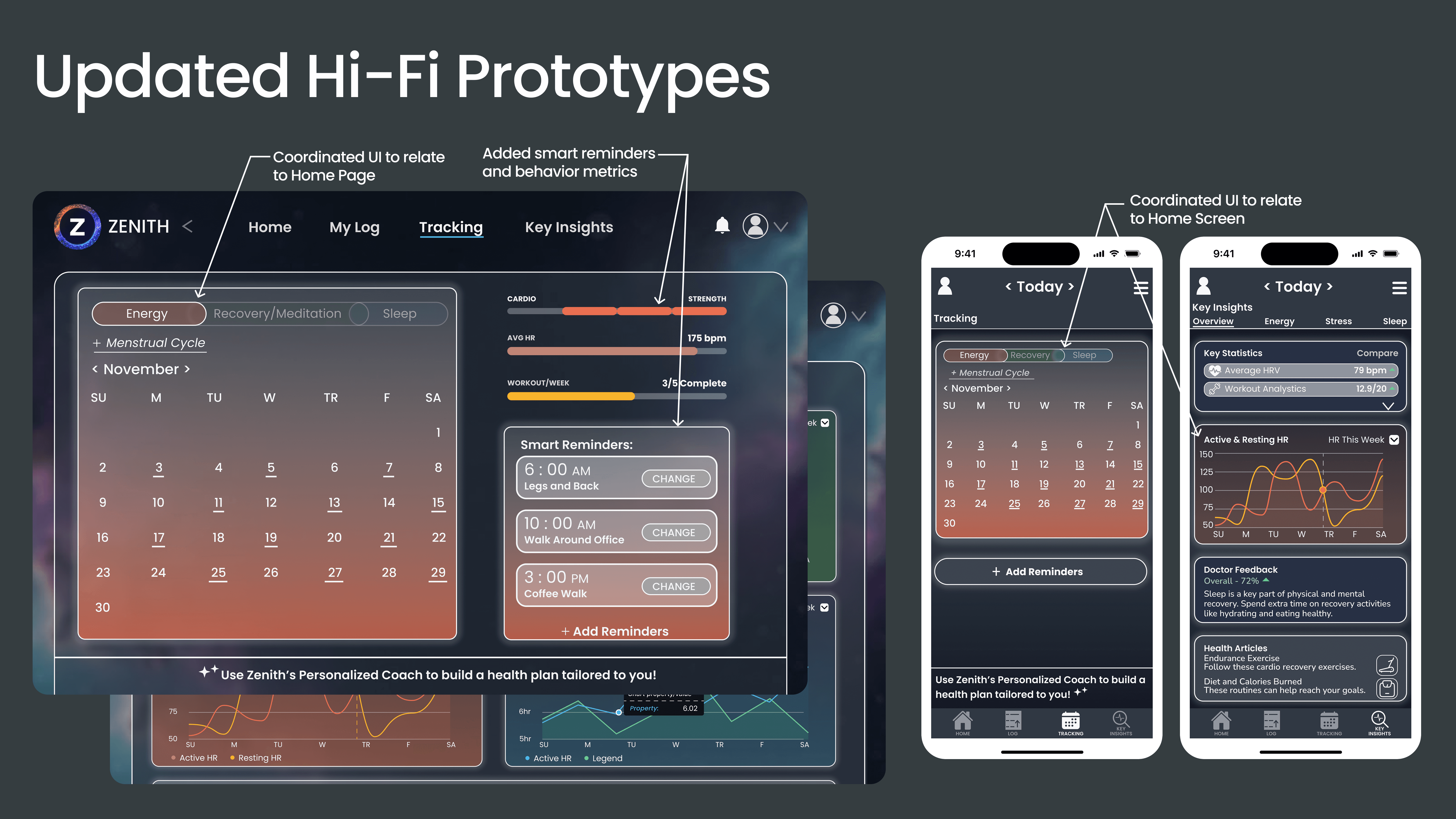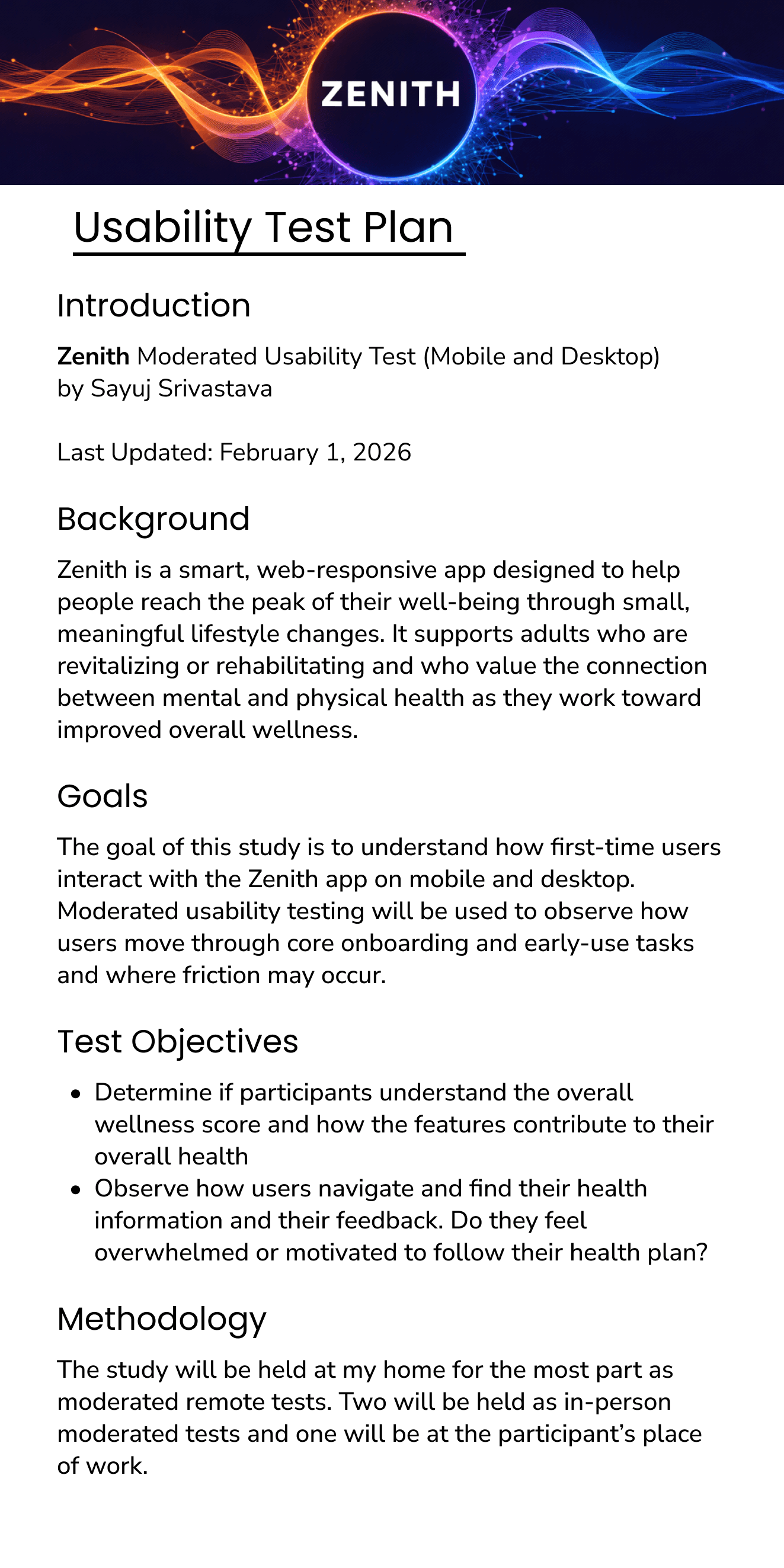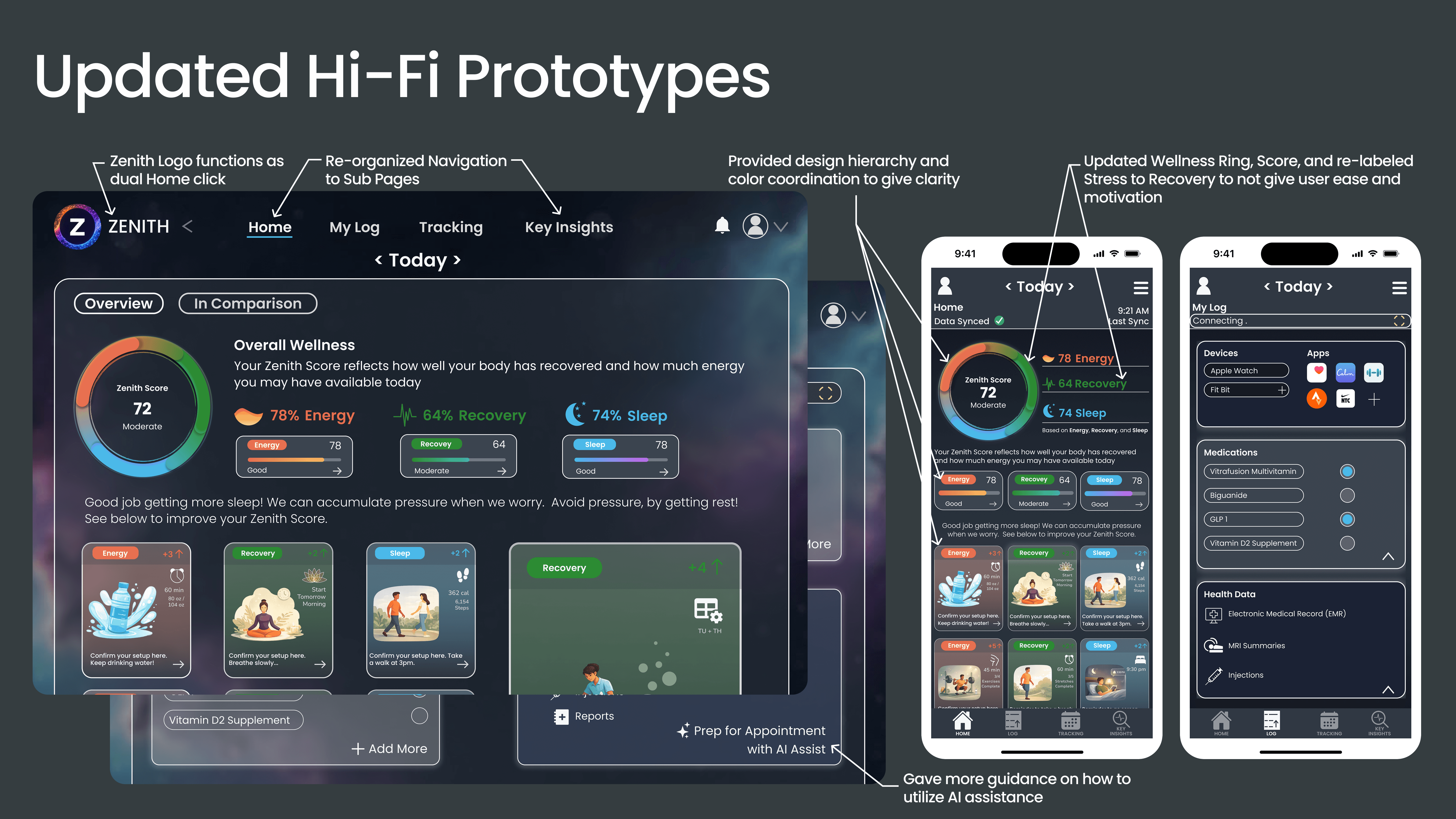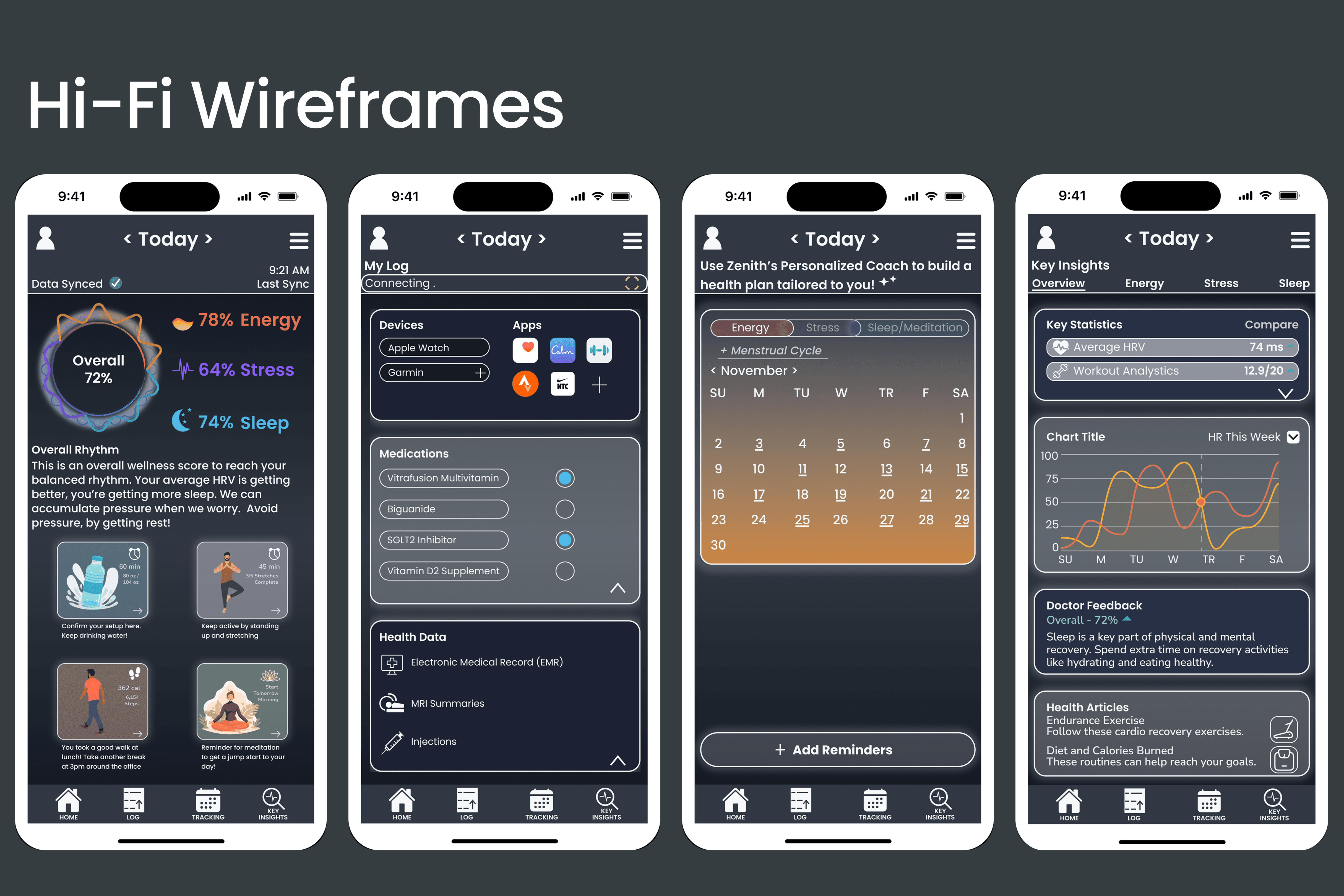 Zenith is a smart web-responsive app designed to help people reach the peak of their well-being by making small, meaningful lifestyle changes. Through seamless health logging, device syncing, and personalized insights, Zenith guides users toward a more balanced daily rhythm. By integrating medical information, tracking habits, and offering gentle, actionable feedback, the app supports users in building healthier routines—one simple step at a time.
