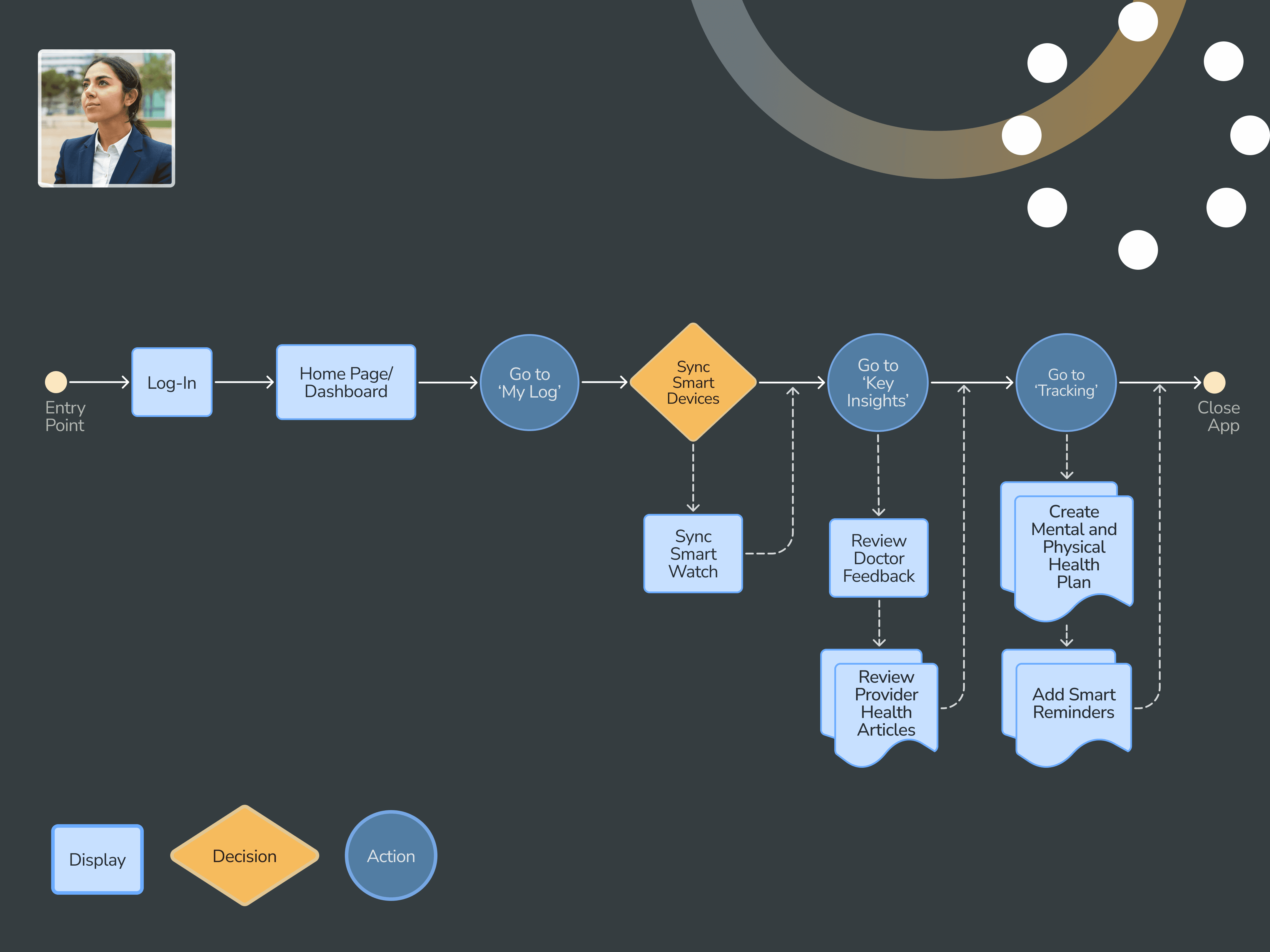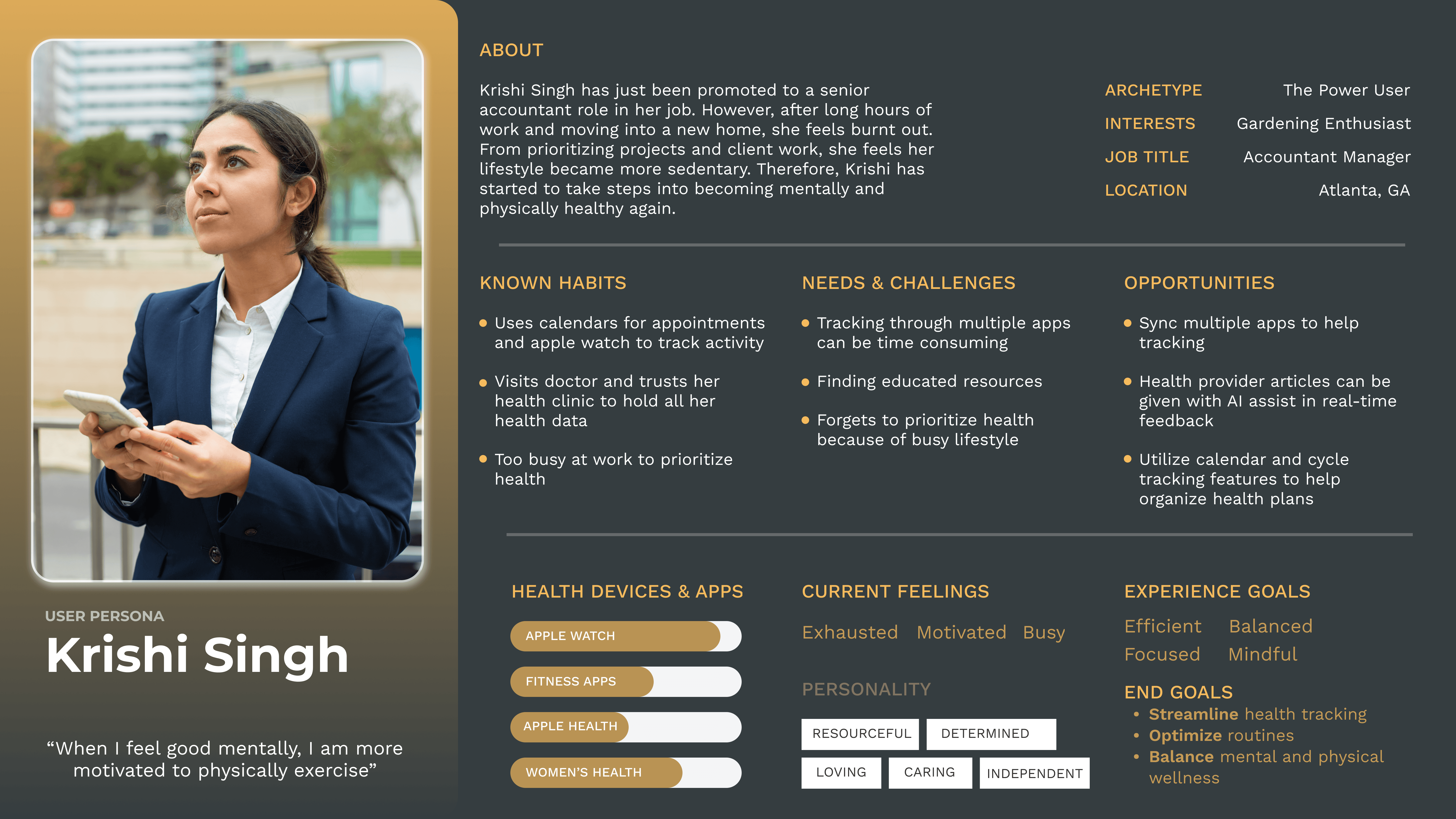 For Krishi, I chose the goal of creating and following a routine. She’s highly motivated but incredibly busy, so seamless syncing from her smartwatch and trusted provider data helps her start a personalized plan with confidence. Her flow focuses on making lifestyle change that feel achievable rather than overwhelming.