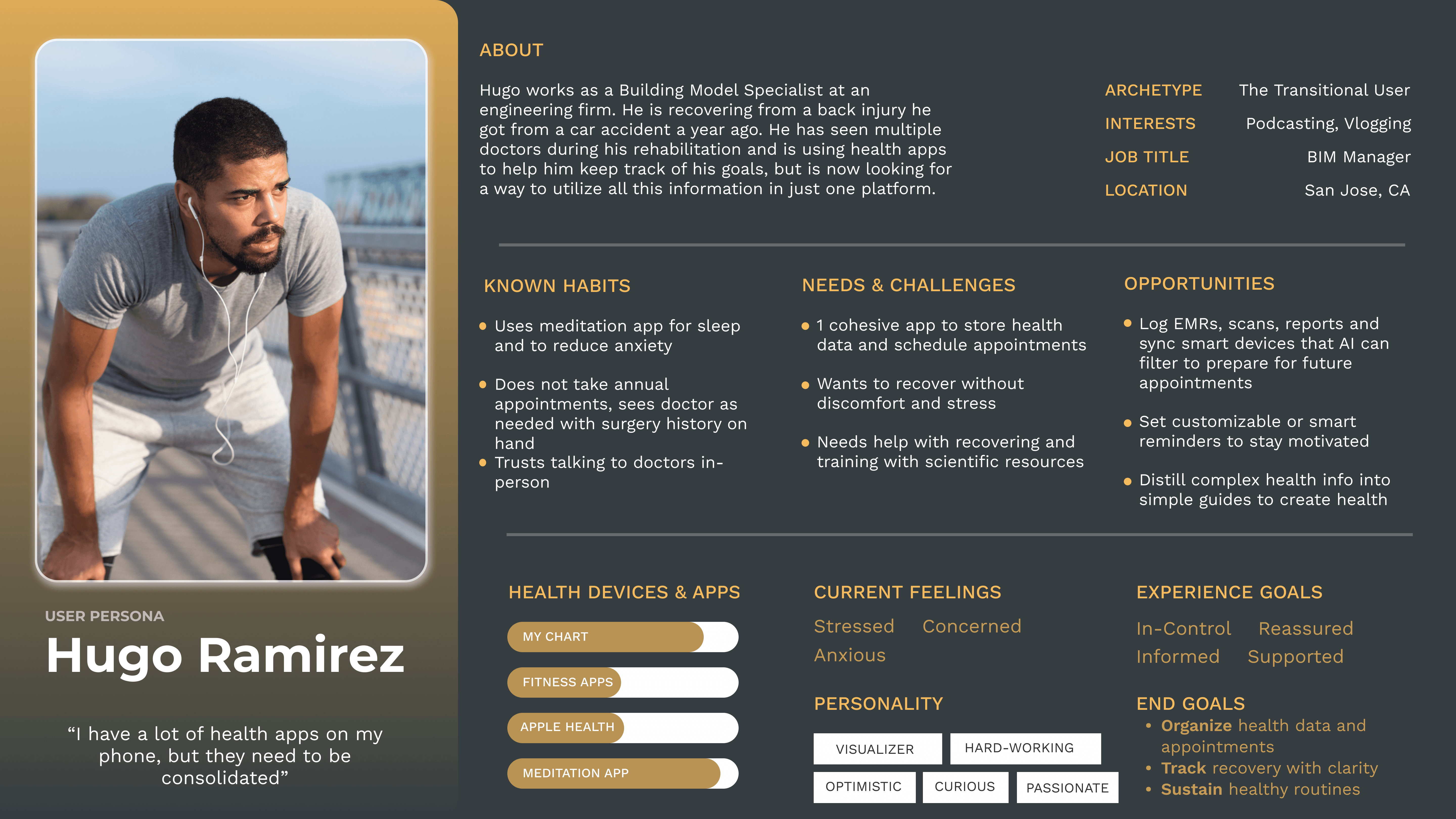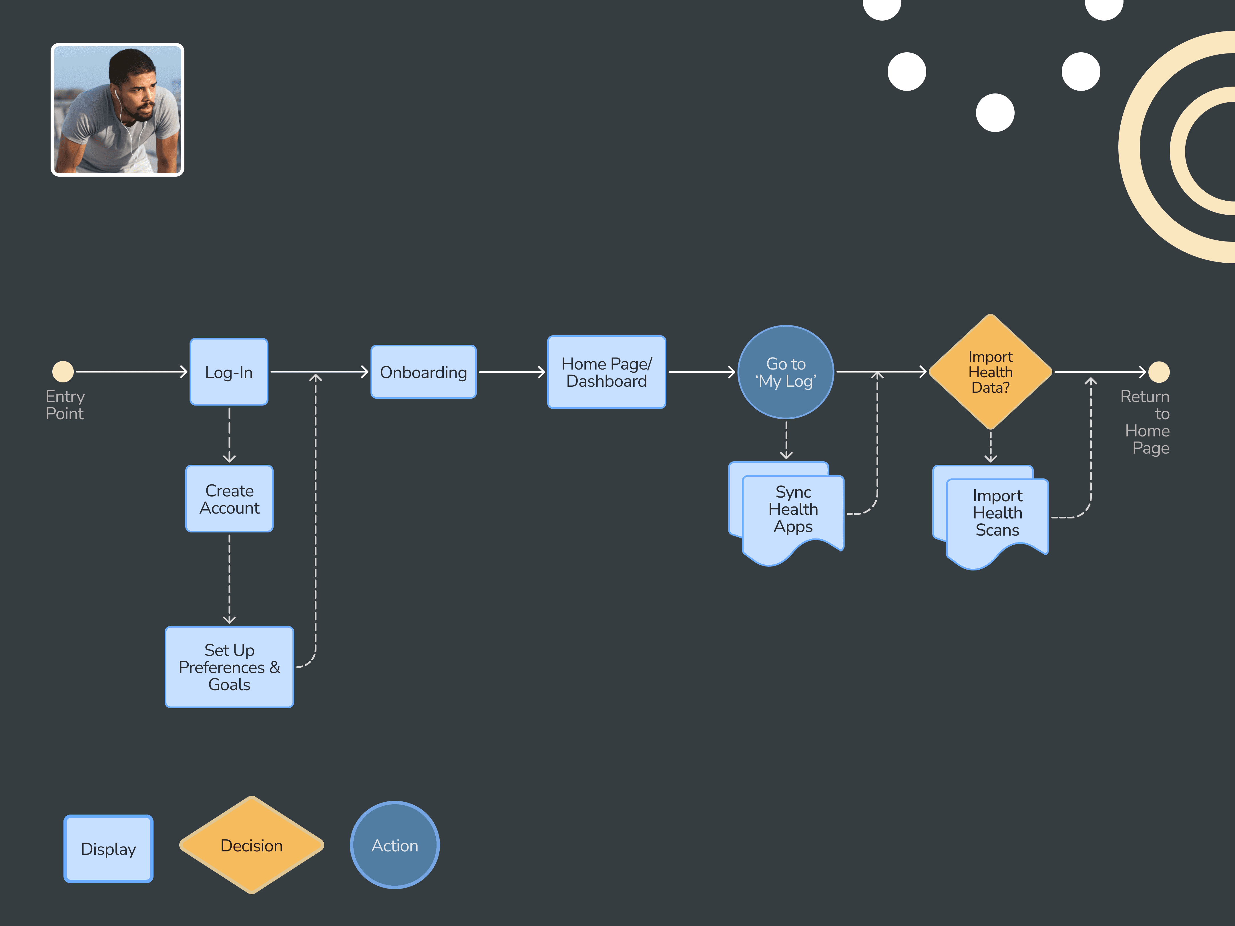 When choosing user goals for the flows, I focused on the most meaningful tasks for each persona. For Hugo, I chose the goal of uploading and syncing his health data because he currently stores information across multiple apps and online tools and still wants to understand how his physical and mental recovery connect. By syncing everything and visualizing it clearly on the home page, he can finally see that full picture.