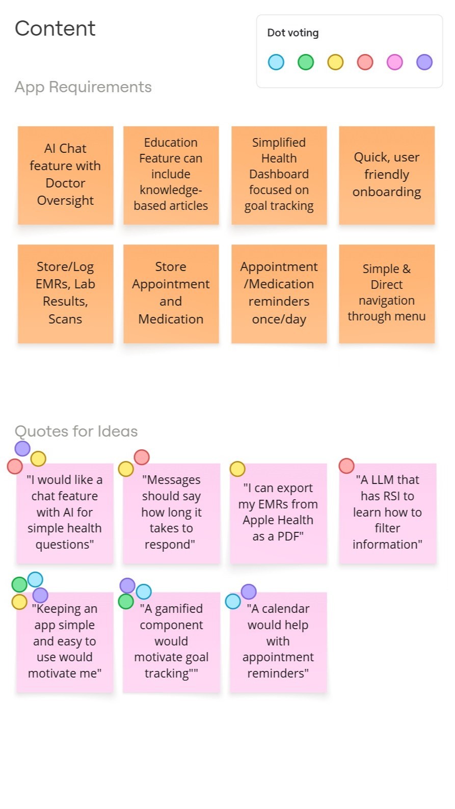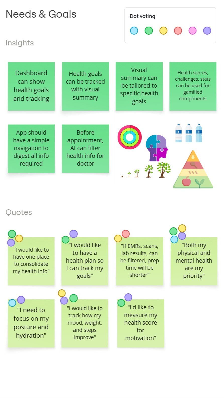 After conducting user interviews, dot voting, and affinity mapping, a key insight emerged: many rehabilitating or revitalizing patients strongly associate their mental and physical health, but they often lack clarity on how these areas influence one another. Despite this uncertainty, they are highly motivated to understand these connections so they can improve their overall well-being in meaningful and manageable ways.
